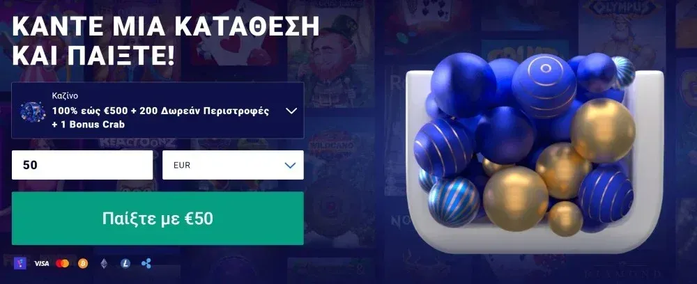 Επεξεργαζόμαστε όλες τις καταθέσεις άμεσα χωρίς οποιεσδήποτε χρεώσεις. Αποδεχόμαστε πληρωμές από ελληνικές τράπεζες και δεν χρεώνουμε πρόσθετες προμήθειες μετατροπής. Η ελάχιστη κατάθεση ξεκινά από 10 €, για την ενεργοποίηση του bonus καλωσορίσματος απαιτούνται τουλάχιστον 20 €.